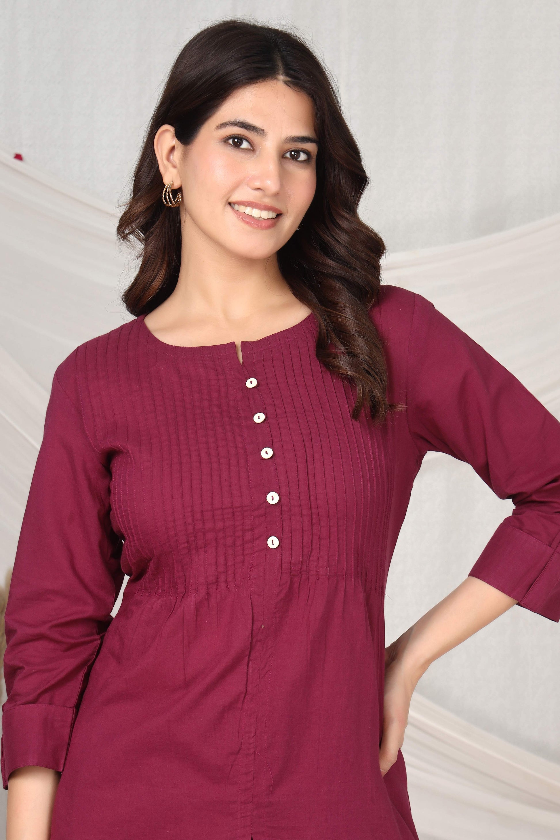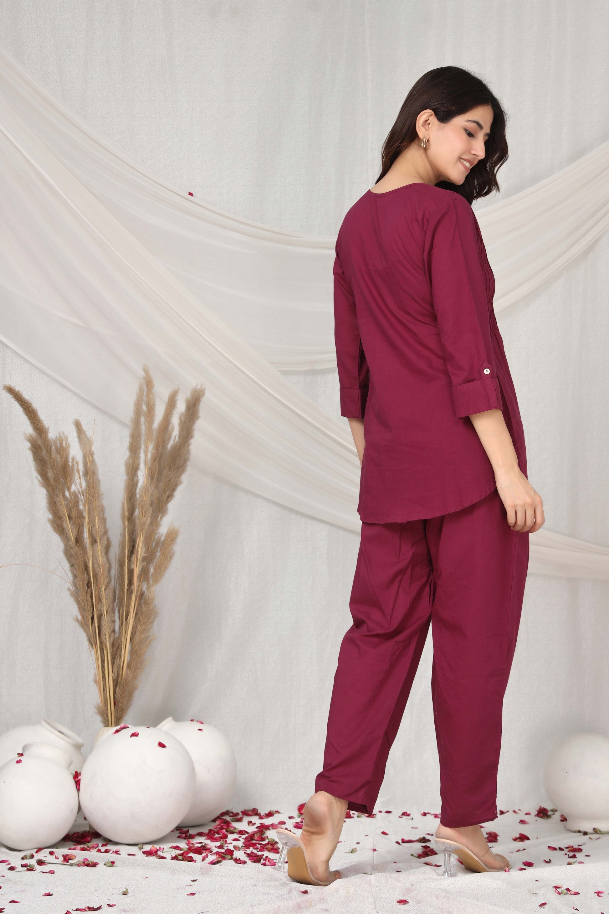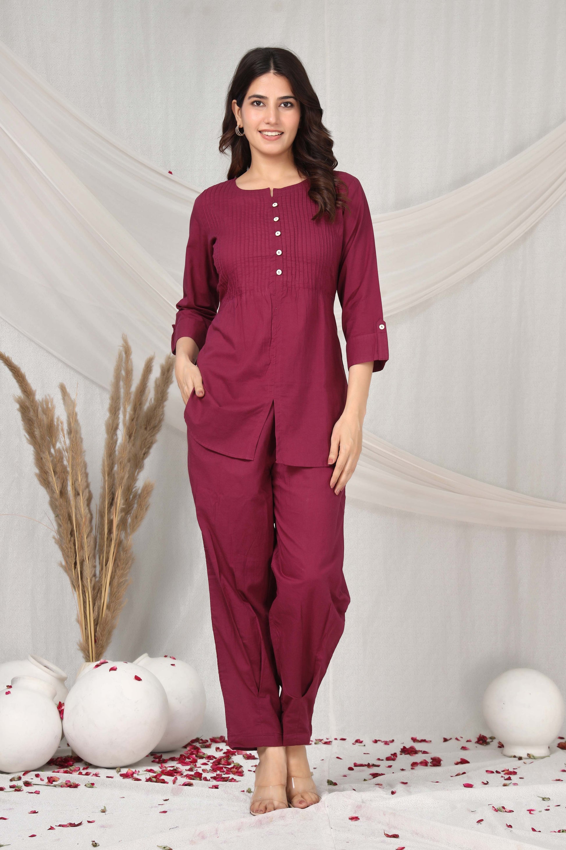 Elevate your wardrobe with this sophisticated crimson charm co-ord set, expertly crafted from premium cotton for all-day comfort and breathability. The coordinated two-piece ensemble features a refined silhouette that transitions seamlessly from casual outings to semi-formal occasions. The rich crimson hue adds a touch of elegance while remaining versatile enough to pair with your existing accessories. Constructed with delicate fabrics, this set requires gentle washing to maintain its color vibrancy and fabric integrity. Perfect for those who appreciate quality craftsmanship and timeless style, this co-ord set delivers both sophistication and wearability in one thoughtfully designed piece.