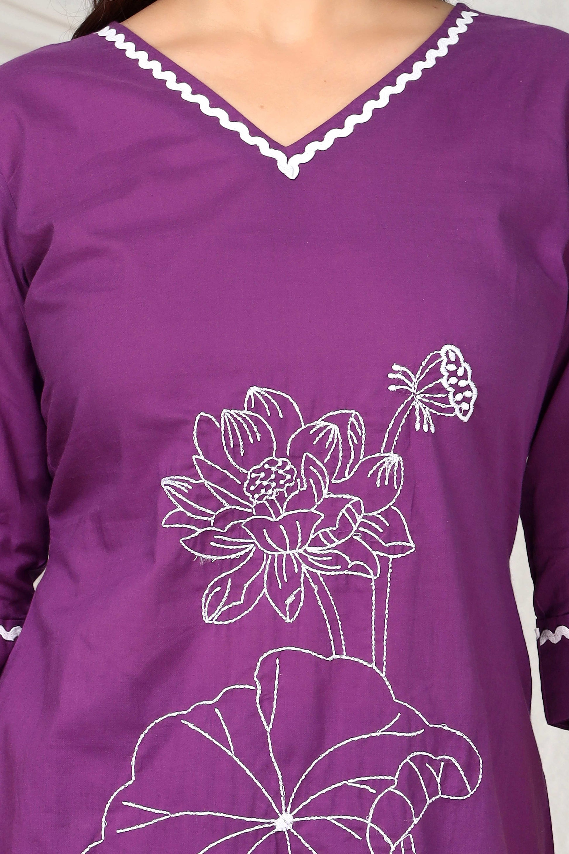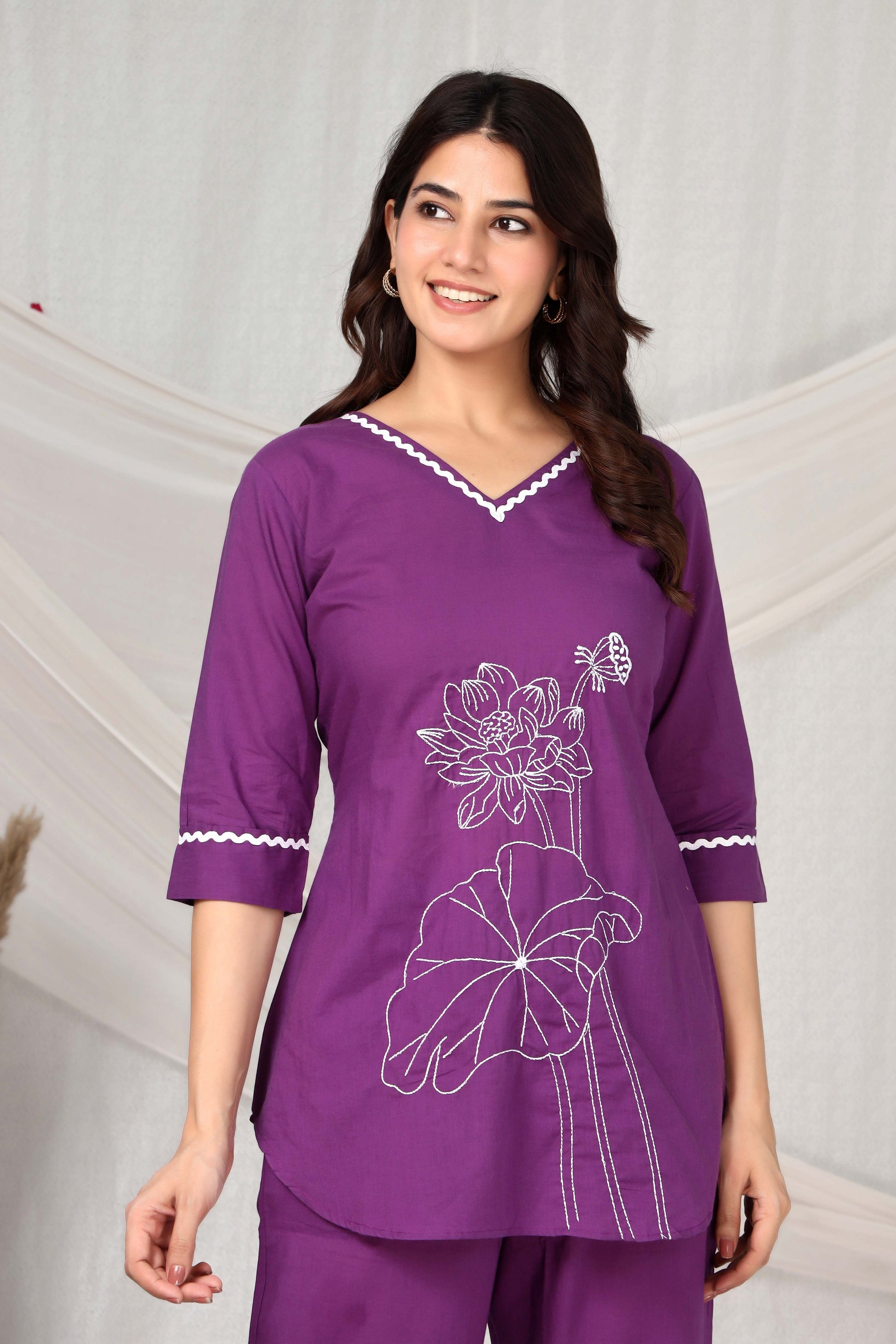 Elevate your wardrobe with this sophisticated lavender co-ord set, featuring intricate embroidery detailing that showcases refined craftsmanship. The solid construction paired with delicate embroidered accents creates a versatile piece perfect for both casual gatherings and semi-formal occasions. The classic V-neck silhouette flatters various body types while maintaining an elegant aesthetic. Crafted with attention to detail, this set combines comfort with contemporary style, making it an essential addition to your collection.